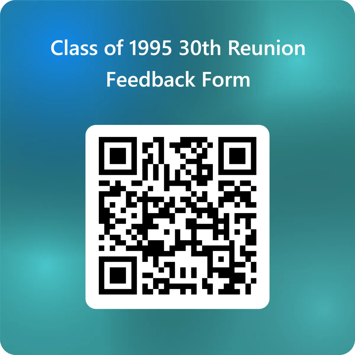 Thank you so much for coming to our 30 year reunion. We hope you enjoyed reconnecting and reminiscing with each other. Below you'll find the memories slideshow, a gallery of photos taken during the reunion, and a QR Code/ link to our Reunion Feedback Form. We hope you'll take a few minutes to complete this survey and help us improve future reunions.